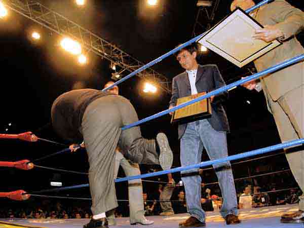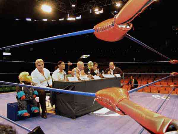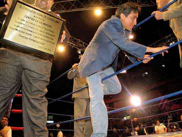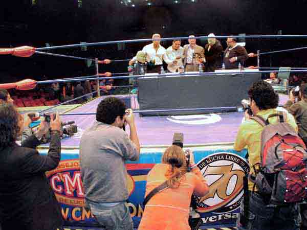 | Lo más extraño era ver a mitad del el ring una mesa con micrófonos, jarras de agua y los nombres de quienes en breve ocuparían la silla correspondiente: Alfonso Morales, director de Luna Córnea; Héctor Mauleón, periodista y escritor; Sangre Azteca, luchador; Salvador Lutteroth, actual propietario de la Arena México, descendiente del fundador; Orlando Jiménez, comunicólogo y fanático de la lucha libre, y Shocker, también luchador. |